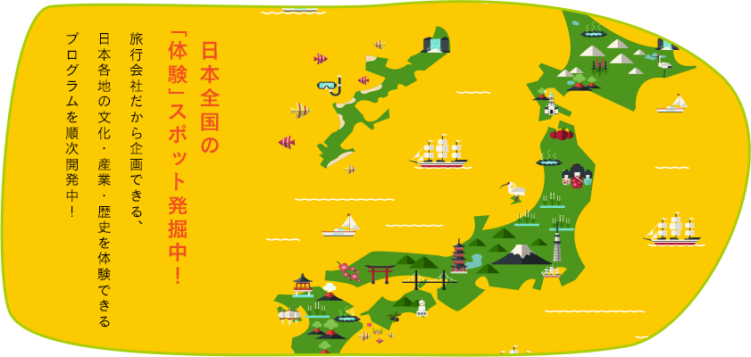 『現地へ出かけて体験する』『親子で遊びながら(体験しながら)学べる』企画を考案し、自然や科学の仕組み、産業の成り立ちなど“旅行”を通じて、自然に学んでいく仕組みを提供しております。お子様だけの参加では無く親子で参加し、ご家族で体験を共有することで、“体験”を“思い出”としてご提供して行ければと考えております。