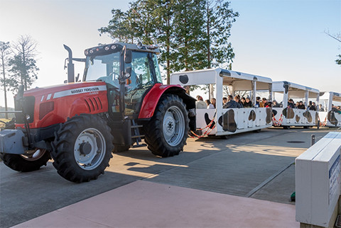 1日を締めくくるマザーファームツアーは、専用トラクターで牧場をぐるりと1週! 牧羊犬の活躍や羊さんたちへの餌やりも楽しんでください!
