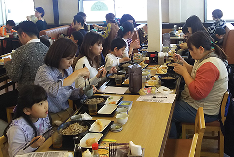 打ったそばはみんなで食します!そば粉から自分で打ったそばのお味はいかがかな? 「サガミ」さんからは、天ぷらとお稲荷さんもサービス!