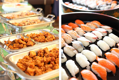 お子様の気分と体調に合わせてお寿司やステーキなどからお好きなメニューを選べるバイキング方式! 会場も貸切なので、ゆったりとお召し上がりください
